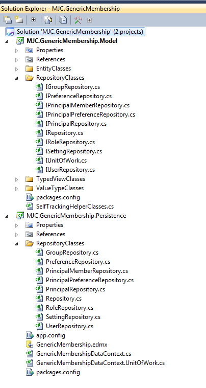 Upon re-generating the code, the visual studio solution looks as follows. Notice the new directories and repository classes.