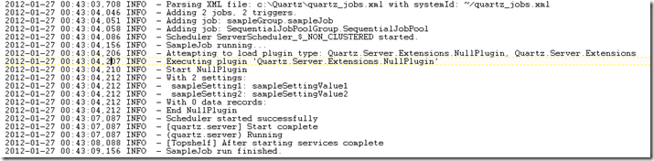 <?xml version="1.0" encoding="utf-8"?> <schedules> <!– The incrementType can be: Milliseconds, Seconds, Minutes, Hours, Days, None, Once –> <schedule jobId="1" increment="10000" incrementType="Milliseconds" lastRun="2012-01-27T00:46:34" nextRun="2012-01-27T00:46:44" /> </schedules>The 2nd file - plugins-quartz-schedule.xml – describes the schedule for the job. These XML files are created as a sample when you run the SequentialJob for the first time. The nice thing about this file, is that it’s constantly changing. To turn off a job, just set the “nextRun” value of the jobId to a future date far into the future. Change the increment and incrementType at any time to change the schedule for this job.